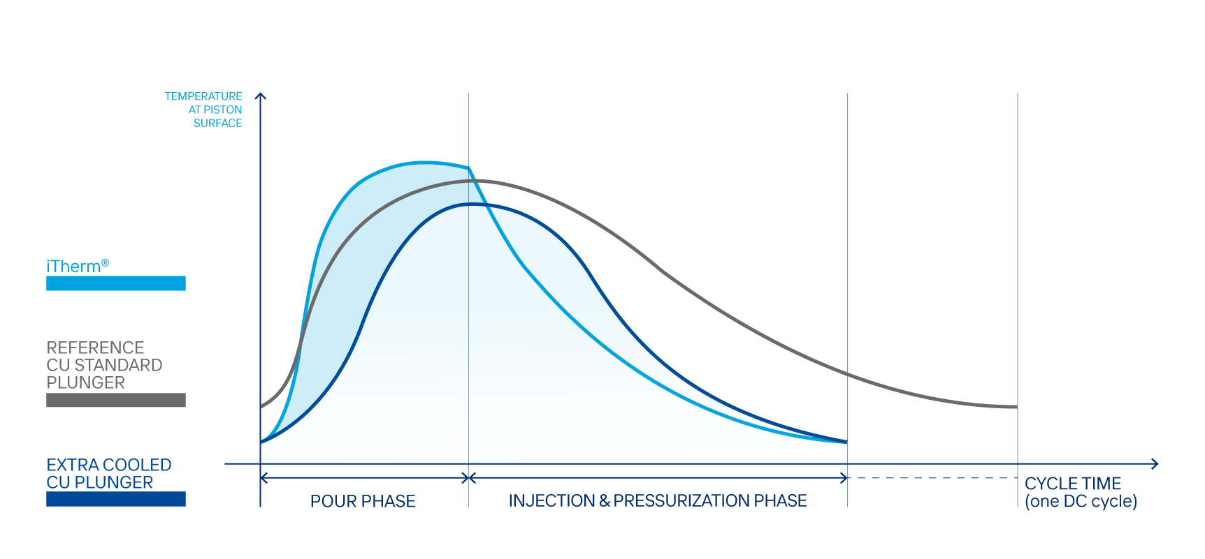 In the pour phase of the cycle, iTherm® Piston temperature is higher compared to other pistons, (low heat capacity of steel membrane) preventing premature aluminium solidification.